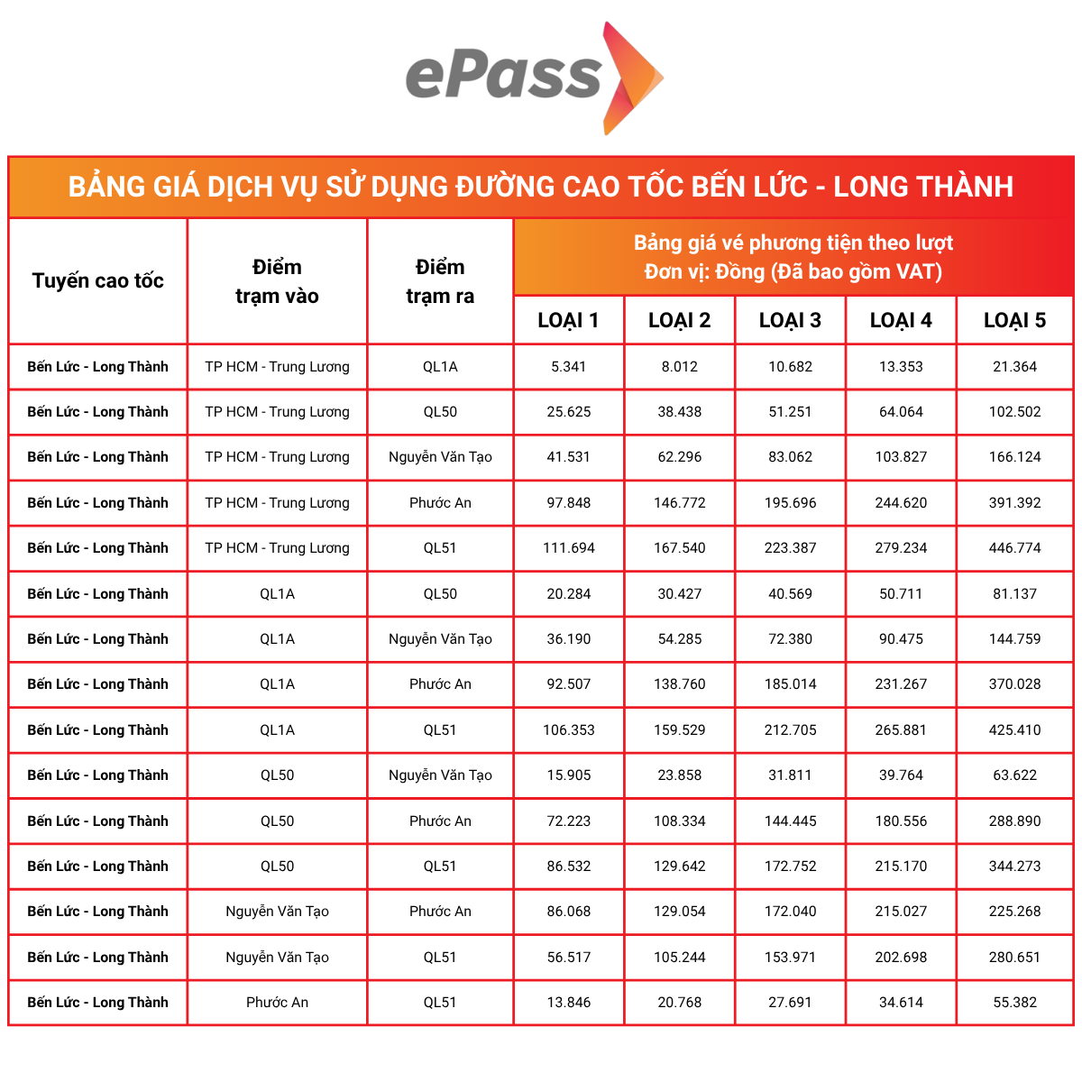 Bảng giá đường cao tốc Bến Lức – Long Thành