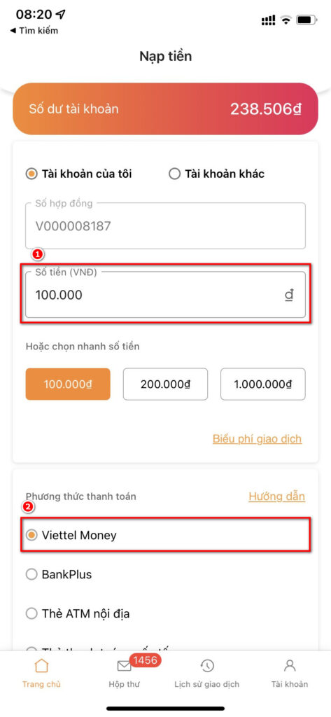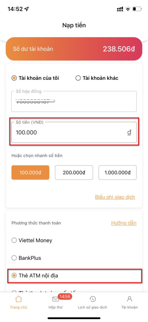 Bước 4: Chọn “Biển số xe” hoặc “Số hợp đồng” >> Nhập mã khách hàng hoặc biển số xe >> Nhập “Số tiền cần nạp” >> Làm theo hướng dẫn