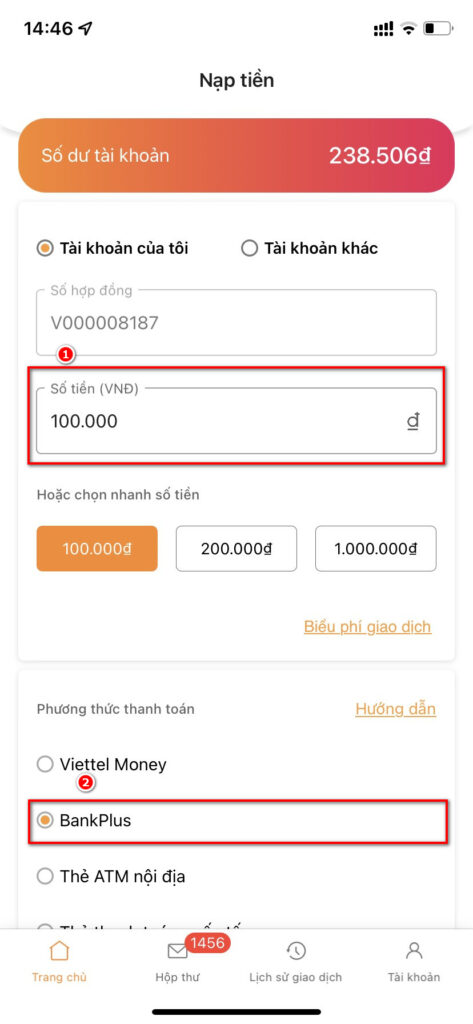 Bước 2: Nhập “Số tiền” >> Chọn phương thức thanh toán “BankPlus” >> Chọn “Nạp tiền”