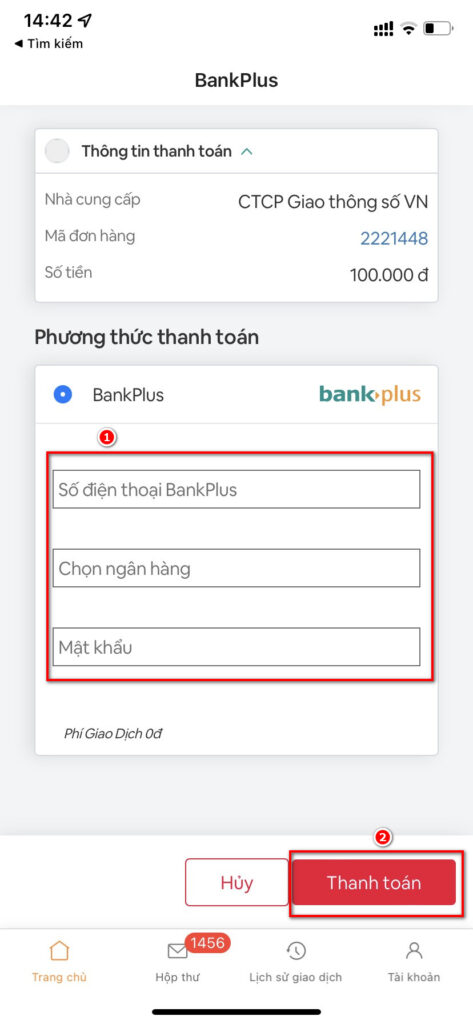 Bước 3: Nhập “Số điện thoại Bankplus”, Chọn “Ngân hàng” và “Mật khẩu” >> Chọn “Thanh toán”