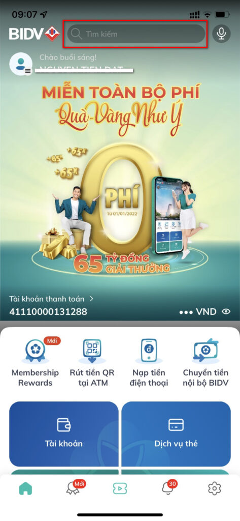 Bước 1: Đăng nhập ứng dụng BIDV >> Chọn “Tìm kiếm”
