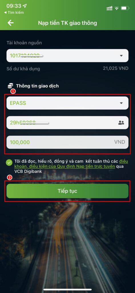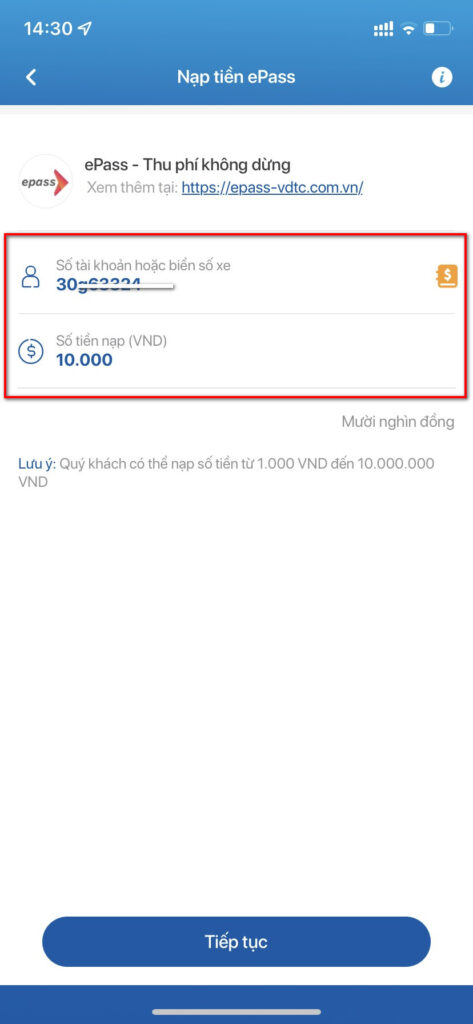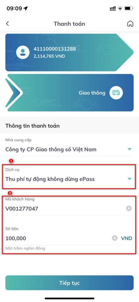 Bước 2: Nhập “Mã khách hàng hoặc biển số xe” và “Số tiền” >> Chọn “Tiếp tục”