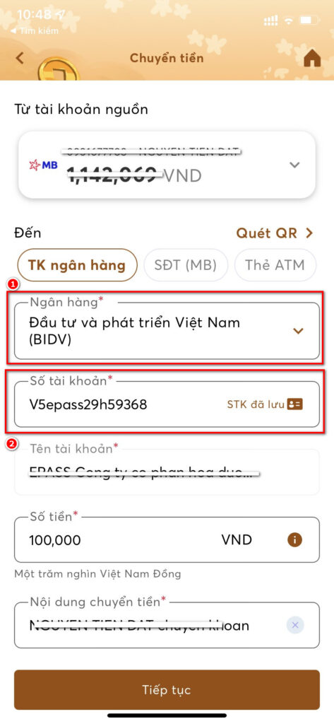 Bước 1: Đăng nhập ứng dụng ngân hàng Quý khách đang sử dụng >>> Chuyển khoản đến ngân hàng: BIDV và Nhập số tài khoản người thụ hưởng theo cấu trúc: “V5epass + biển số xe hoặc Mã khách hàng”