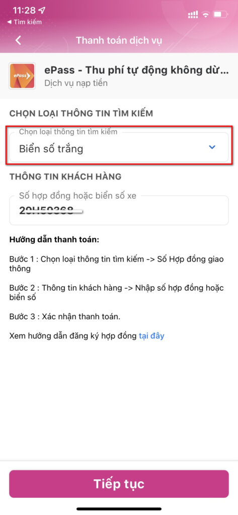 Bước 2: Nhập “Biển số xe hoặc Số hợp đồng” >> Chọn “Tiếp tục”