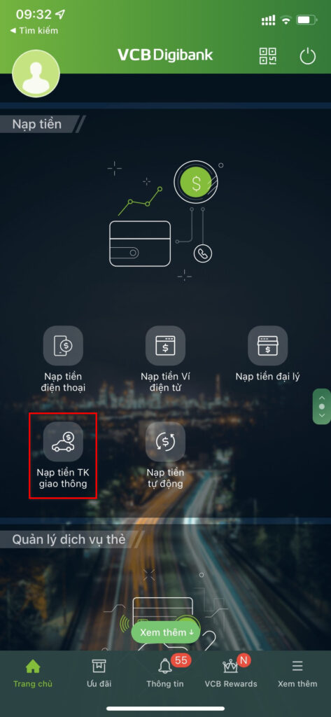 Bước 1: Đăng nhập ứng dụng Vietcombank >> Kéo xuống mục nạp tiền: Chọn “Nạp tiền TK giao thông”