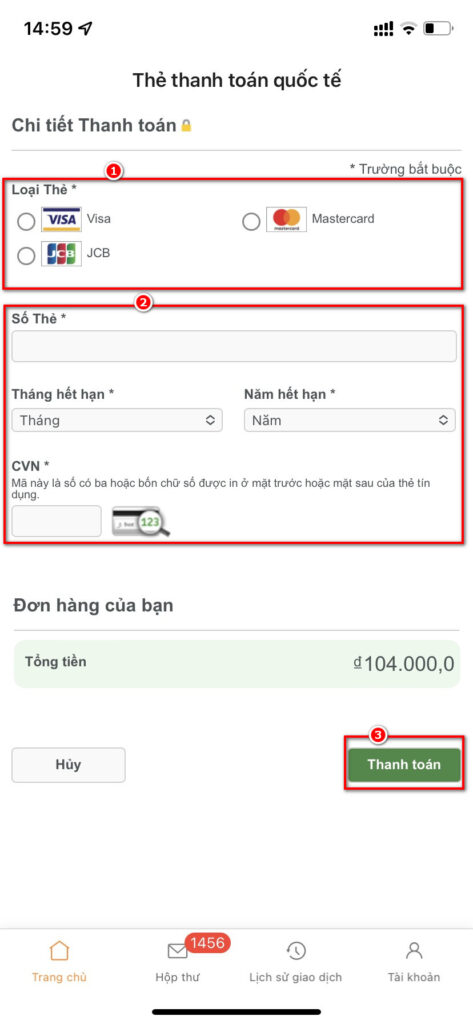 Bước 3: Chọn “Loại thẻ”, Nhập thông tin thẻ >> Chọn “Thanh toán” >> Làm theo hướng dẫn