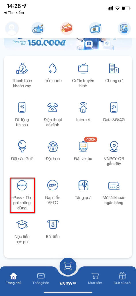 Bước 1: Đăng nhập ứng dụng VNPay >> Kéo xuống, Chọn “ePass – Thu phí không dừng”
