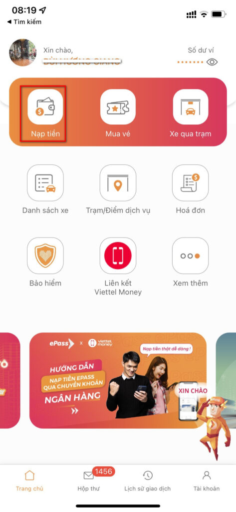 Bước 1: Đăng nhập ứng dụng ePass >> Chọn ” Nạp tiền”
