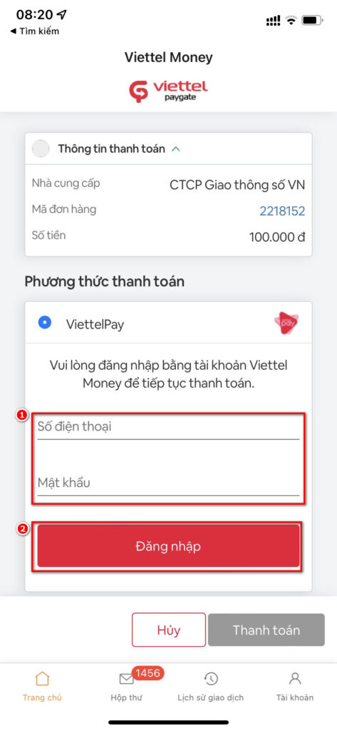 Bước 3: Nhập “Số điện thoại và Mật khẩu” tài khoản Viettel Money >> Chọn “Đăng nhập”