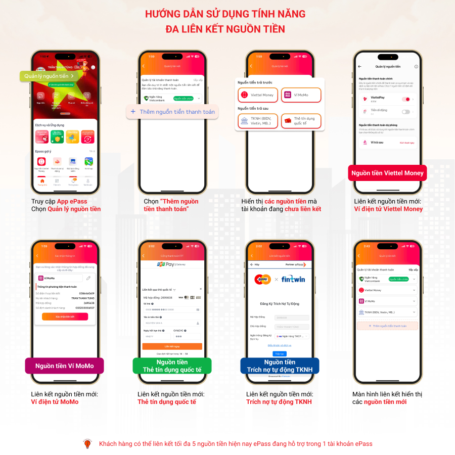 Hiện nay ePass đã tích hợp tính năng đa liên kết nguồn tiền. Đây là tính năng cho phép khách hàng liên kết nhiều nguồn tiền vào chung 1 tài khoản ePass