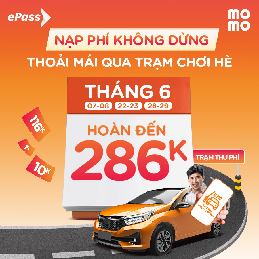Áp dụng 6 ngày vàng: 07, 08, 22, 23, 28 và 29/06 thôi. Hè cùng gia đình du lịch đó đây, nhanh tay nạp tiền trước vào tài khoản ePass để qua trạm an tâm lại có cơ hội hoàn đậm đến 286.000Đ. Nạp ngay!